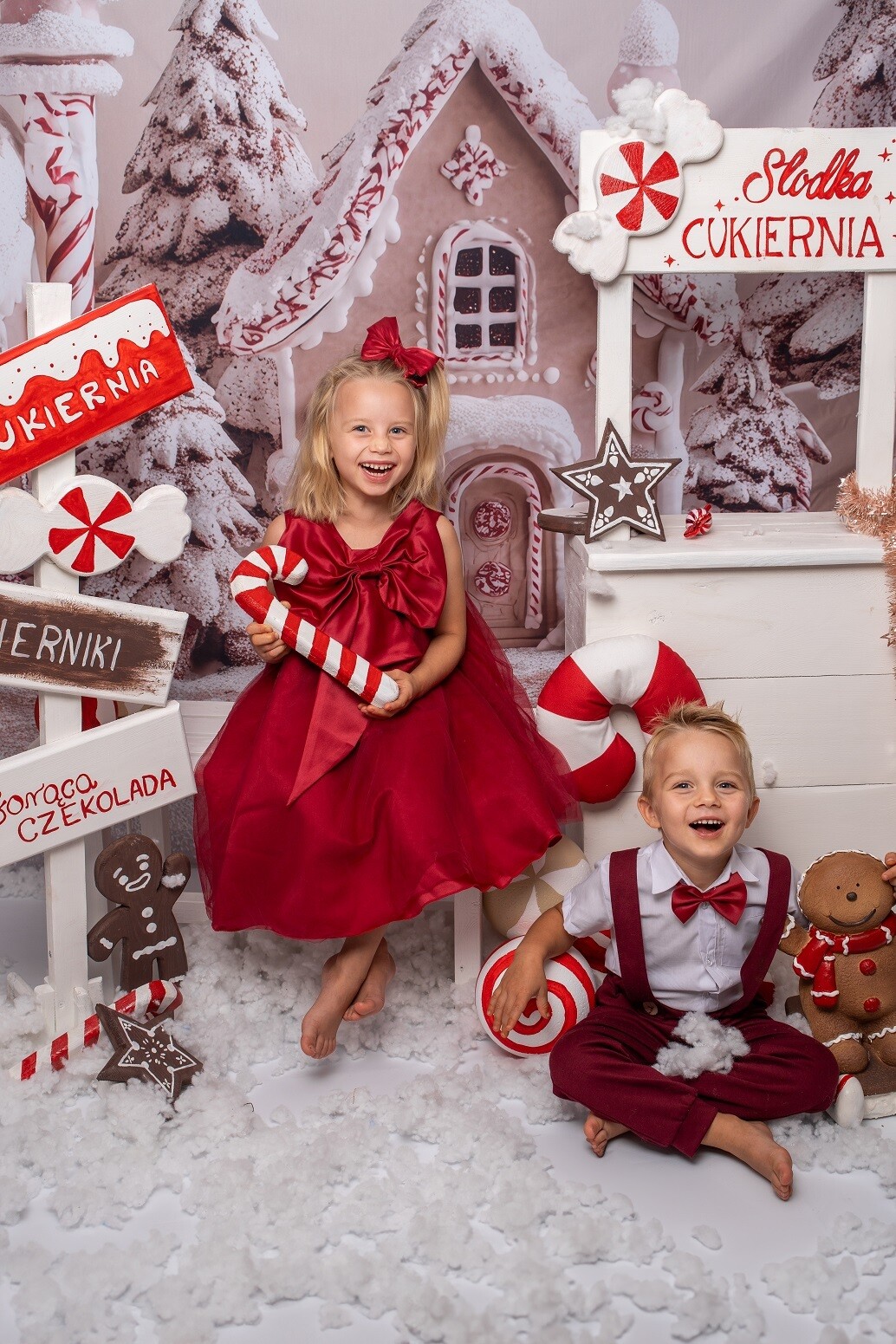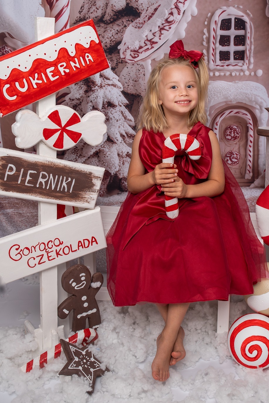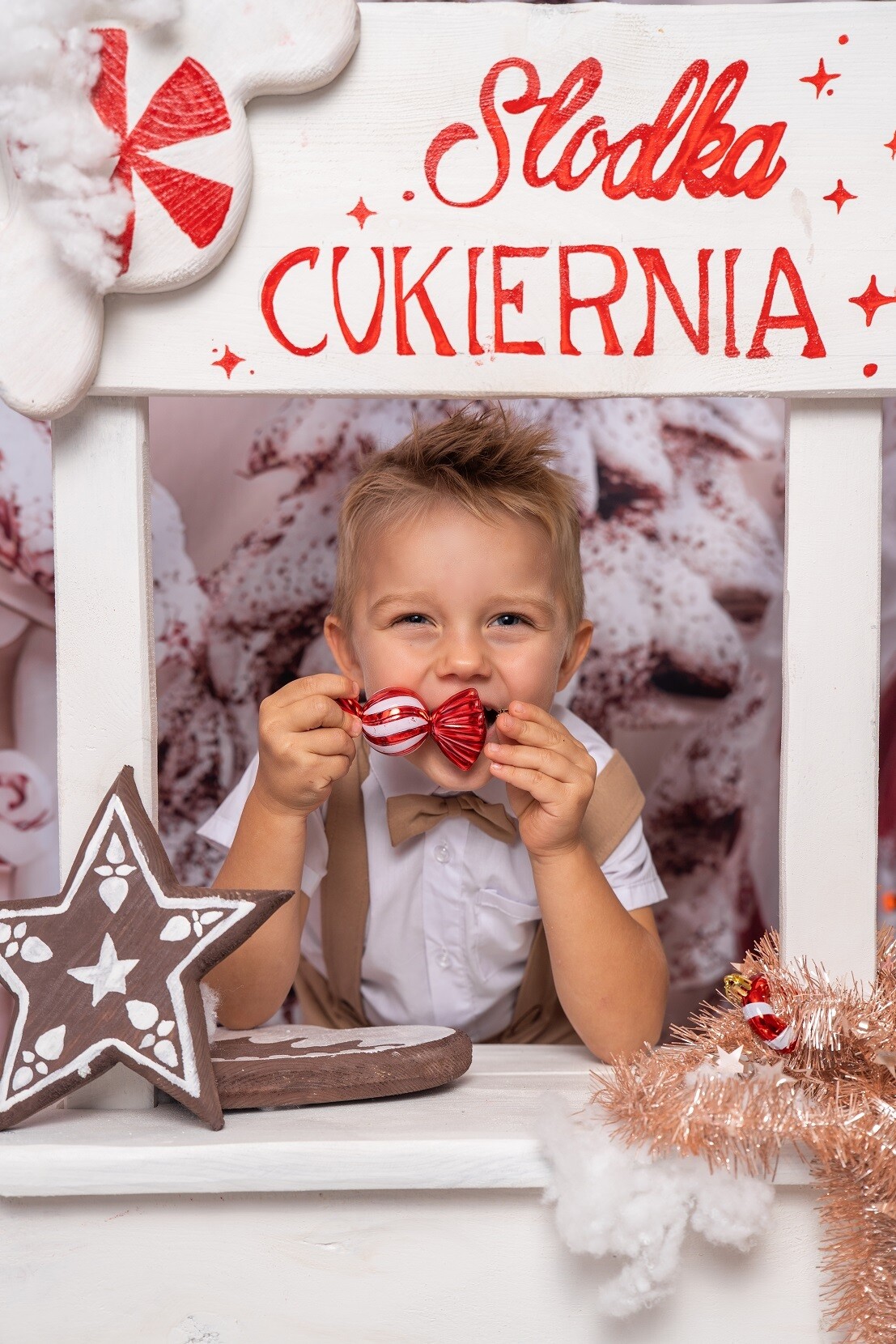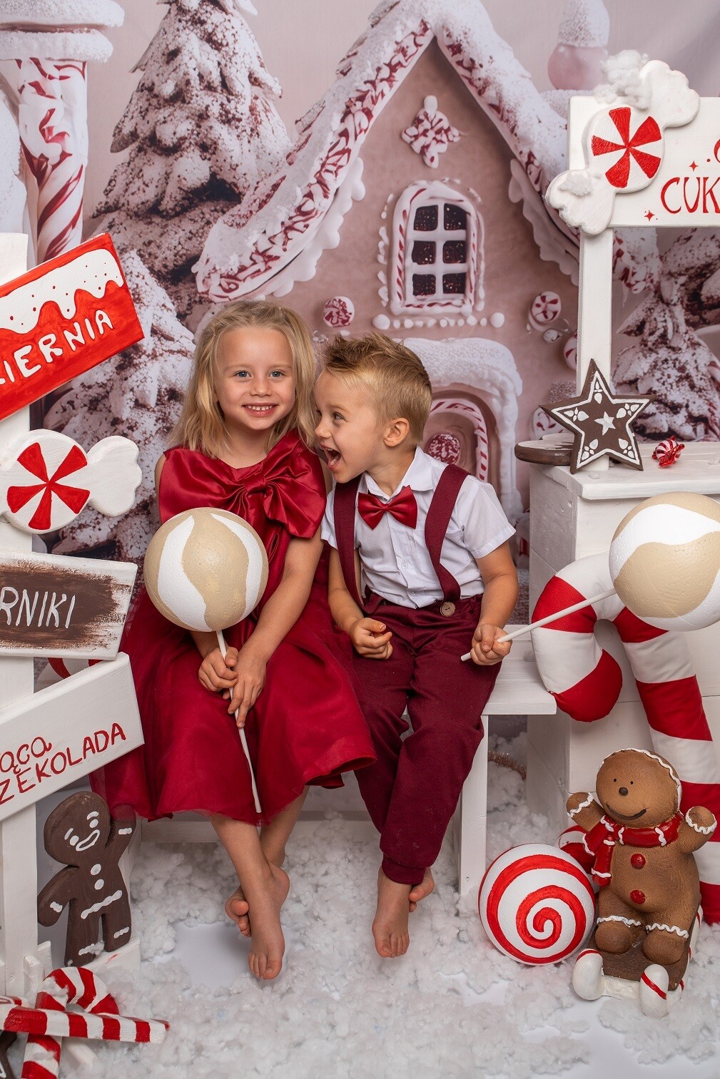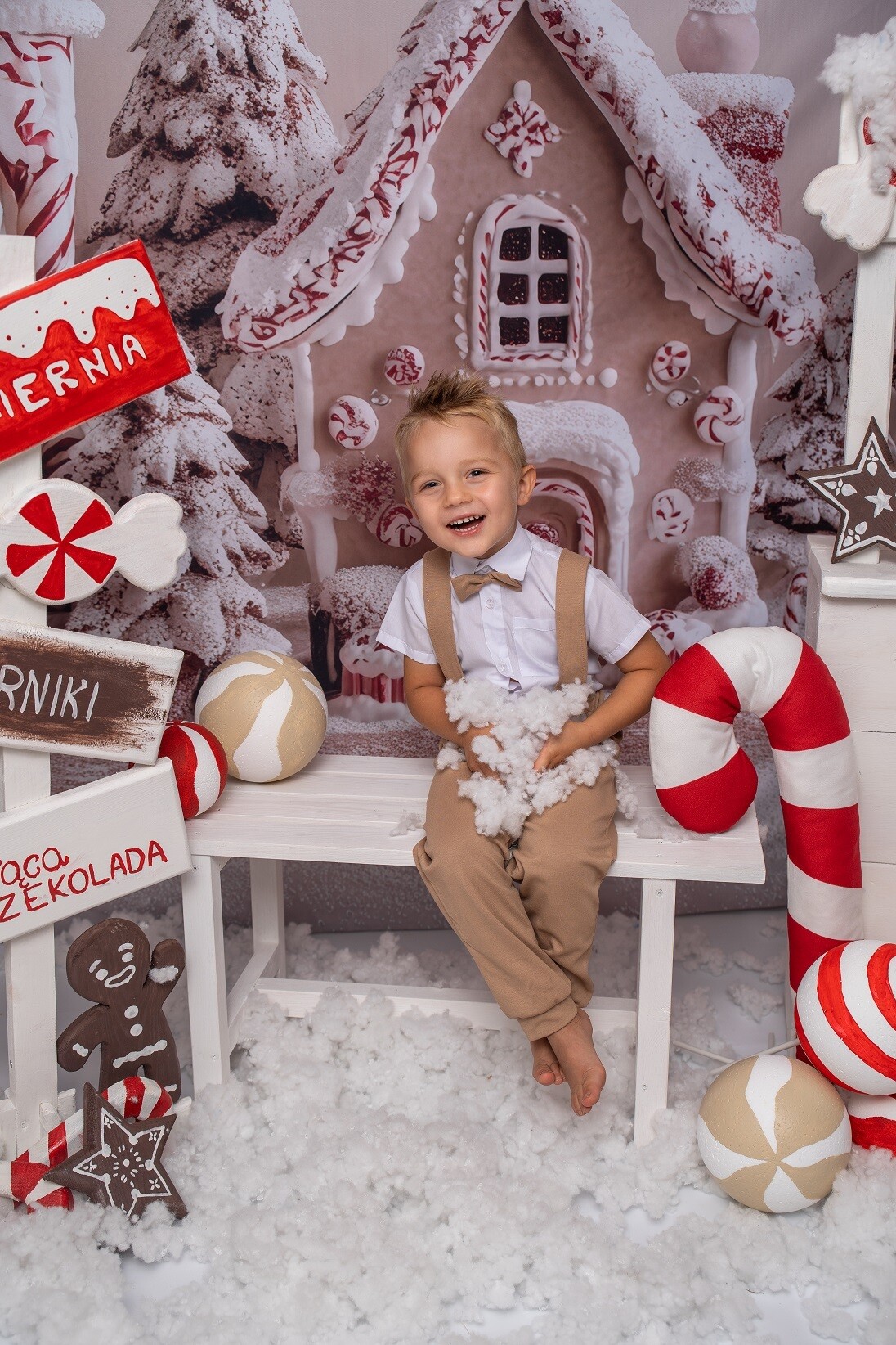 Na widocznych obok zdjęciach, przenoszących nas do prawdziwej cukierkowej krainy, zostało wykorzystane tło z naszej bożonarodzeniowej kolekcji – wzór nr 12. To właśnie ono buduje magiczny, świąteczny klimat i pozwala stworzyć bajkową oprawę dla dziecięcych portretów.