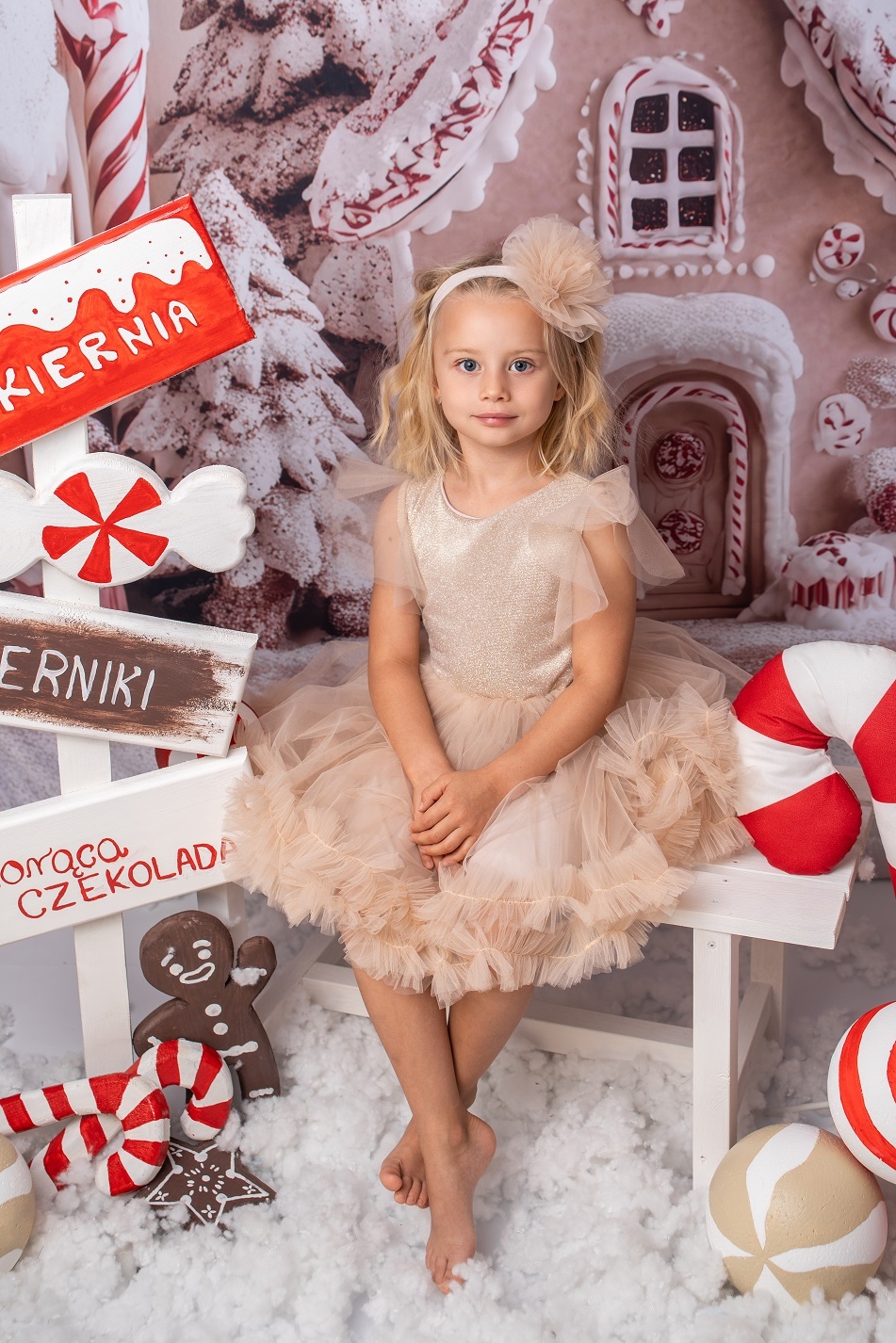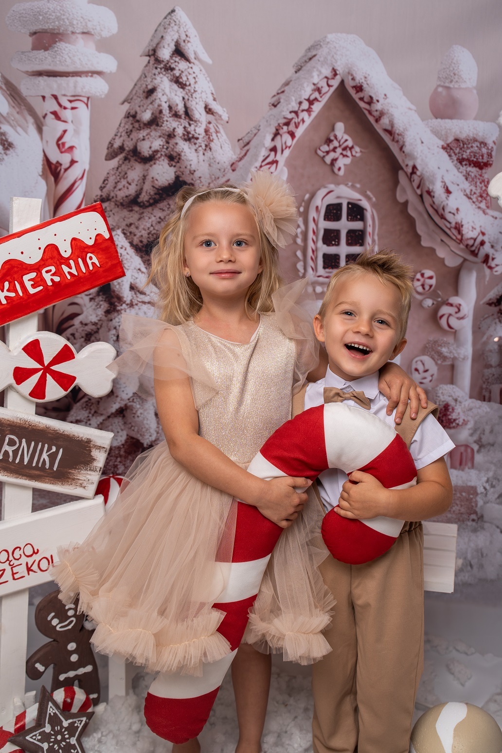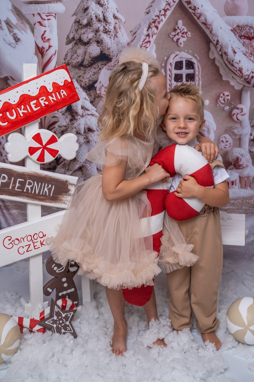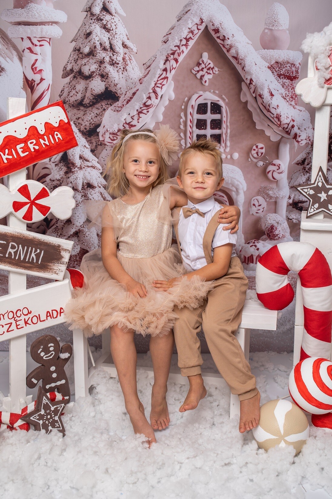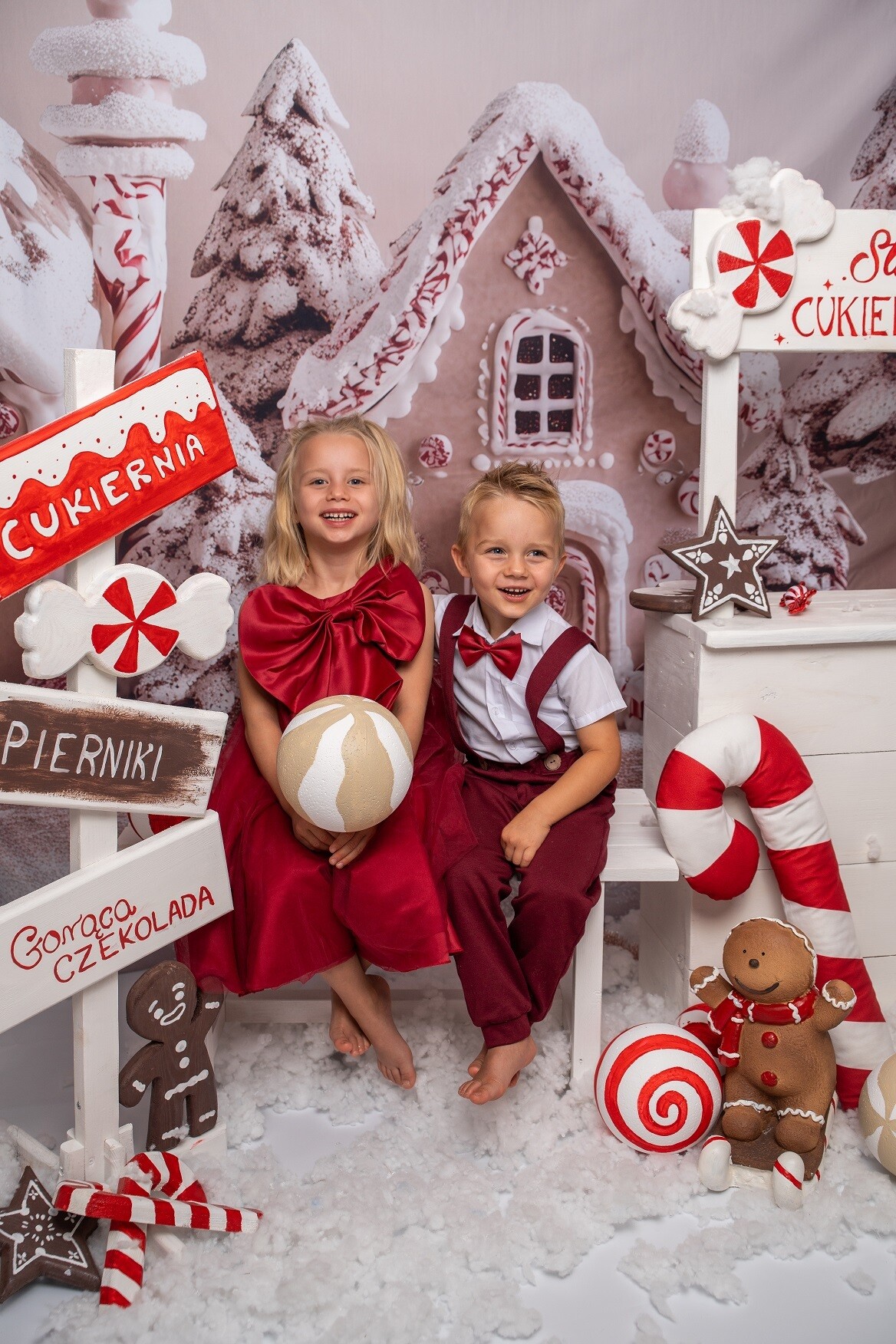 Na widocznych obok zdjęciach, przenoszących nas do prawdziwej cukierkowej krainy, zostało wykorzystane tło z naszej bożonarodzeniowej kolekcji – wzór nr 12. To właśnie ono buduje magiczny, świąteczny klimat i pozwala stworzyć bajkową oprawę dla dziecięcych portretów.